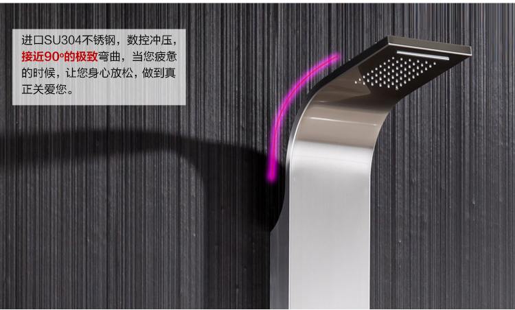 多檔獨(dú)立控制開關(guān)設(shè)計(jì)--配置進(jìn)口閥芯,使用更方便,更快捷,使用壽命更長,使用壽命是普通花灑的5倍以上!進(jìn)口超厚304無鉛不銹鋼一體成型--永遠(yuǎn)不生銹,豪華頂噴、動(dòng)感瀑布、按摩背噴、手持花灑多功能出水設(shè)計(jì),出水量大,按摩效果好,讓您感受多種淋浴體驗(yàn)!