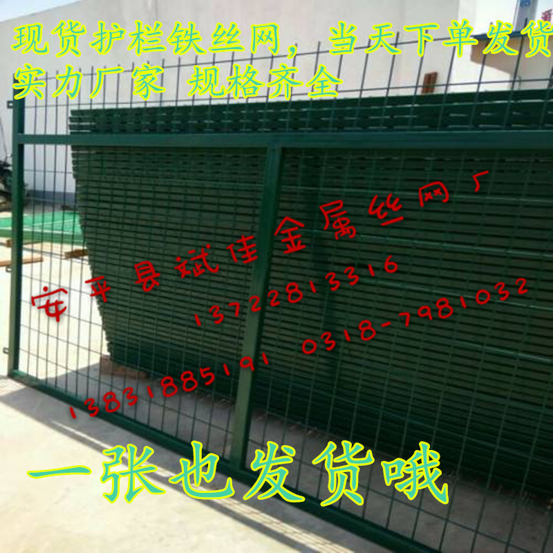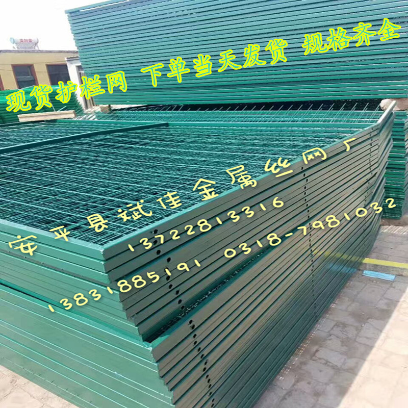 公路防護(hù)網(wǎng)產(chǎn)品屬性 在這里列舉三種框架護(hù)欄網(wǎng)1. 網(wǎng) 孔mm:75x150 50*50 網(wǎng) 片mm:1800x3000 邊 框mm:20x30x1.5 網(wǎng)絲浸塑mm:0.7-0.8 網(wǎng)絲塑后mm:6.8 立柱尺寸mm:48x2x22002. 雙邊絲護(hù)欄網(wǎng) (1). 浸塑絲經(jīng): 3.5mm--8mm; (2). 網(wǎng) 孔: 60mm x 120mm 四周雙邊絲; (3). 最大尺寸:2300mm x 3000mm; (4). 立 柱: 48mm x 2mm鋼管浸塑處理; (5). 附 件: 防雨帽 連接卡 防盜螺栓; (6) .連接方式:卡接3. 三角折彎護(hù)欄網(wǎng) 浸塑絲徑:5.0mm 網(wǎng)格尺寸:50mm x 180mm 立柱尺寸:48 mm x 2.5mm 網(wǎng)片尺寸:2.3m x 2.9m 加強(qiáng)筋 四道 網(wǎng)格:50x50mm 使用規(guī)范用高強(qiáng)度冷拔絲與低碳鋼絲焊接后經(jīng)過液壓成型,用鏈接附件與鋼管支柱固定。