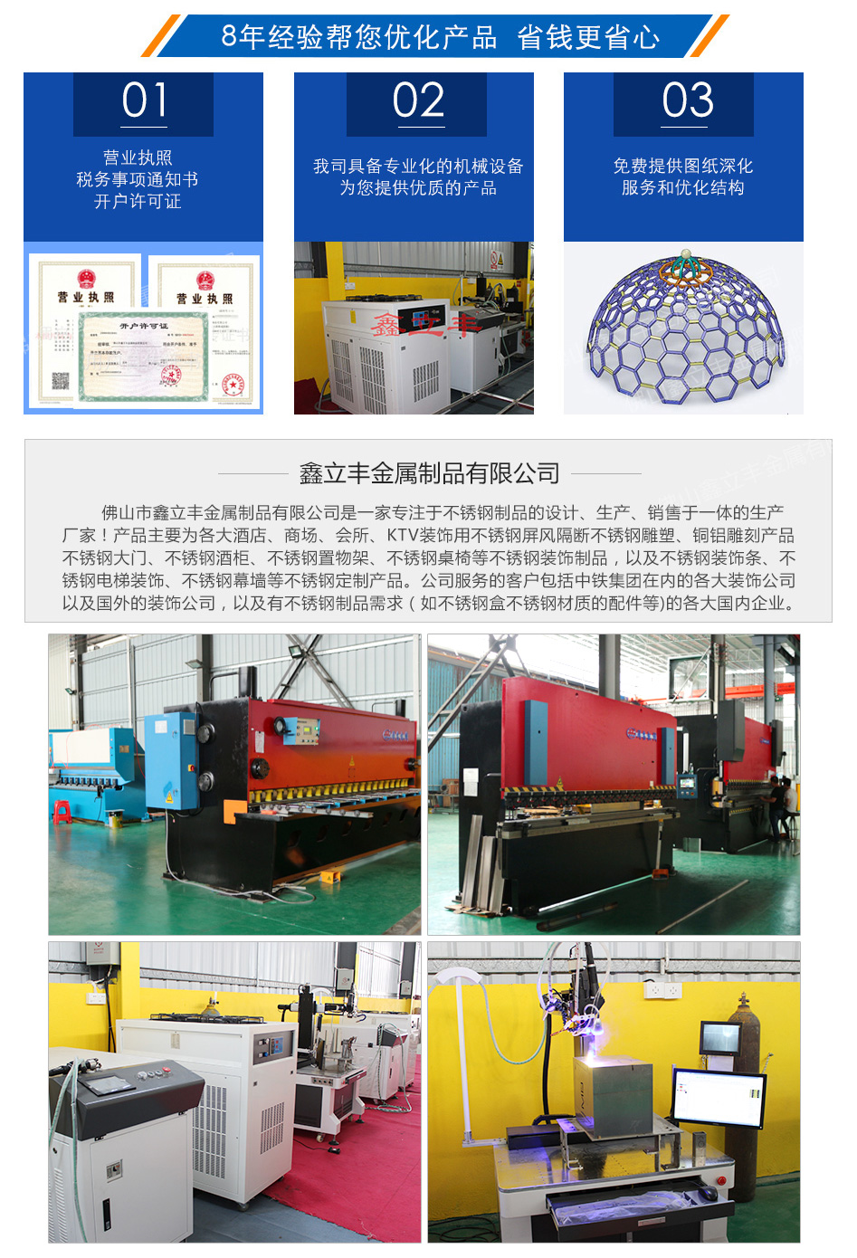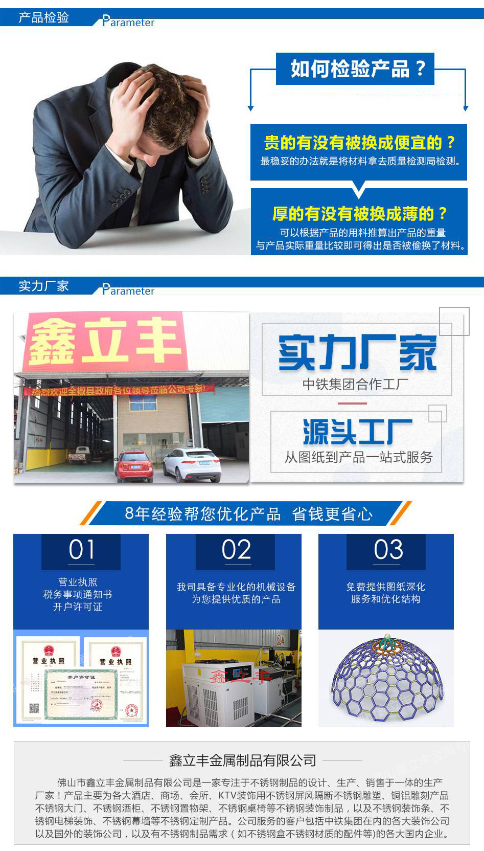 佛 山市鑫立豐金屬制品有限公司承接:不銹鋼屏風(fēng);不銹鋼酒柜/酒架;不銹鋼門套/門框;不銹鋼拉手/扶手/立柱;不銹鋼門;不銹鋼踢腳線;不銹鋼裝飾板等不銹鋼裝飾工程(不銹鋼工程裝飾材料供應(yīng))。公司生產(chǎn)不銹鋼工程裝飾制品、不銹鋼工程裝飾屏風(fēng)、不銹鋼花紋摟空裝飾品、不銹鋼高檔酒架、不銹鋼工程裝飾異形件、不銹鋼奢華拉手、不銹鋼電鍍展示架、不銹鋼電鍍工程門套、大門、不銹鋼金屬標(biāo)識標(biāo)牌、金屬logo、不銹鋼吊頂天花、不銹鋼拱門、不銹鋼雕花、不銹鋼外墻、不銹鋼屏風(fēng)隔斷、不銹鋼大堂、不銹鋼鏡框、不銹鋼走廊、。應(yīng)用在建筑行業(yè),例如建筑物外壁、窗框裝飾、電梯廂板、車廂板、廳堂墻板、天花板、戶外工程、廣告 銘牌、走道板、屏風(fēng)、地道工程、酒店、大堂內(nèi)外墻等大型建筑裝飾酒店、大廈商務(wù)裝飾、公共設(shè)備、新房裝飾、星級酒店,大型商場,絢彩酒吧,奢華ktv,服裝展現(xiàn)柜的奢華裝修。