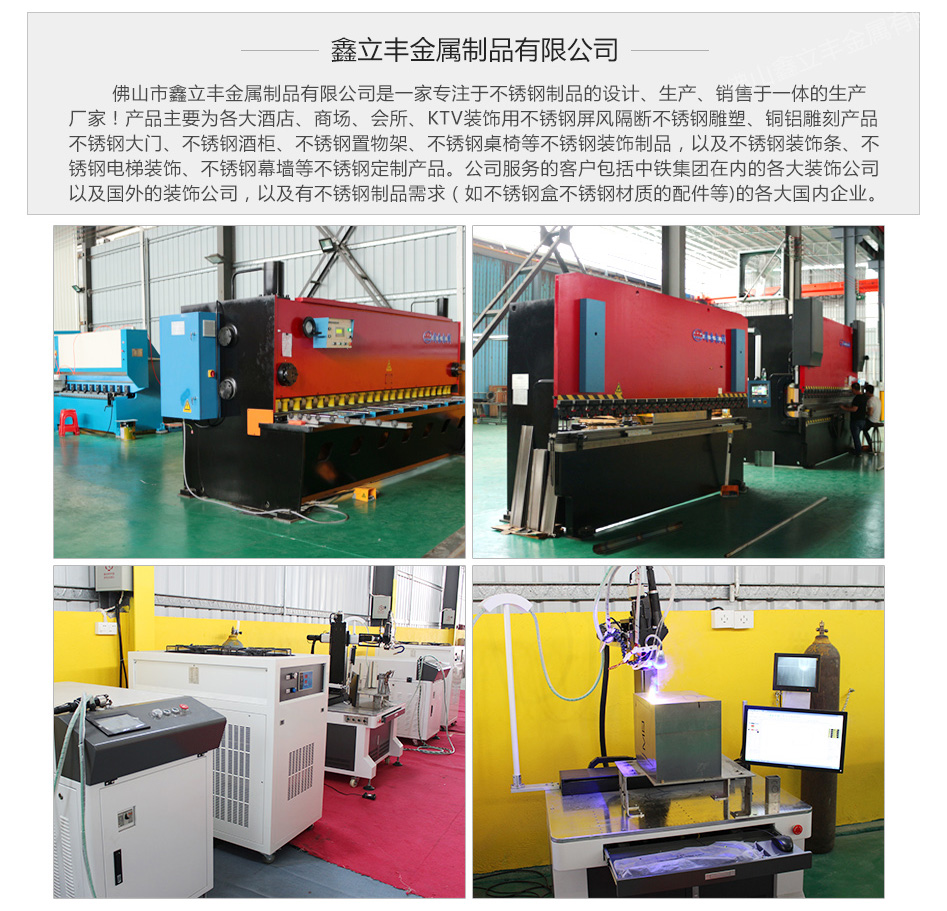 自有工廠,一直致力于訂做星級(jí)酒店不銹鋼工程制品:不銹鋼屏風(fēng)、不銹鋼隔斷、不銹鋼酒店制品、不銹鋼裝飾線(xiàn)條、不銹鋼畫(huà)框、不銹鋼包柱,不銹鋼酒架、不銹鋼門(mén)套,不銹鋼包邊線(xiàn)條、不銹鋼護(hù)攔等。