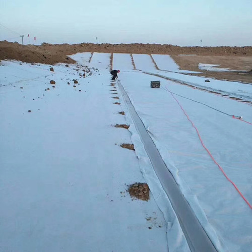 土工布作為土工膜的保護層,使保護防滲層不受損壞。為減少紫外線照射,增加抗老化性能,采用埋入法鋪設。施工中,首先要用料徑較小的砂土或粘土找平基面,然后再鋪設,鋪設時不要繃得太緊,兩端埋入土體部分呈波紋狀,最后在所鋪的兩布一膜上用細砂或粘土鋪一層10cm左右過度層。砌上20-30cm塊石(或砼預制塊)作防沖保護層。施工時,應盡力避免石塊直接砸在上,邊鋪膜邊進行保護層的施工。兩布一膜與周邊結(jié)構物連接應采用膨脹螺栓和鋼板壓條錨固,連接部位要涂刷乳化瀝青(厚2mm)粘接,以防該處發(fā)生滲漏。施工接縫處理是一個關鍵工序,直接影響防滲效果。一般接縫方式有:①搭接:搭接寬度宜于15cm;②熱焊:宜于稍厚的土工膜基材,焊縫搭接寬度不小于5cm.