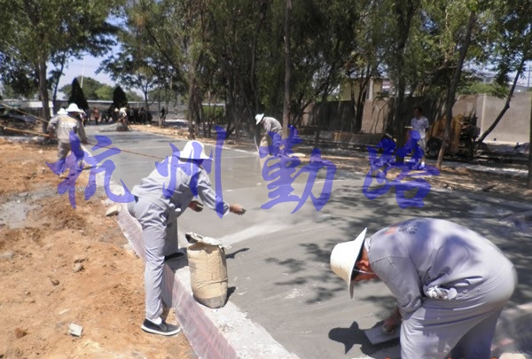 3,混凝土初凝前,以鏝刀將混凝土鏝平,以撒布法將彩色印花料按規(guī)定用量 平均分二至三次均勻撒布于混凝土面層,每次均勻以專(zhuān)用鏝刀進(jìn)行鏝平、 鏝光工作。