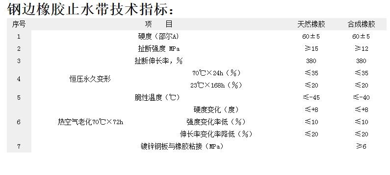 鋼邊止水帶是將熱鍍鋅鋼帶插入硫化橡膠中間是一種新型橡膠止水帶適用于許多大型建筑領(lǐng)域尤其是在水壓高和結(jié)構(gòu)變形量較大時其止水效果更為明顯。普通橡膠止水帶的使用當(dāng)結(jié)構(gòu)變形大時橡膠止水帶則隨著結(jié)構(gòu)的沉降其橫向截面拉長變薄超過其疲勞變形極限時很可能會形成新的滲漏縫隙。而采用鋼邊橡膠止水帶時兩邊的鋼邊與周圍的混凝土結(jié)構(gòu)的粘接極強同是鋼邊與橡同是鋼邊與橡膠粘接極其牢固。當(dāng)結(jié)構(gòu)變形時只存在橡膠部分拉長變薄而鋼邊與混凝土、鋼邊與橡膠之間不會產(chǎn)生新的滲漏縫隙因此用鋼邊橡膠止水帶即增強了結(jié)構(gòu)變形時的防滲性能同時對整個工程的防滲止水起到了重要的質(zhì)量保證。