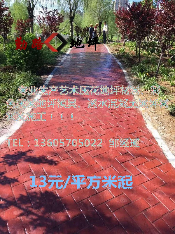 壓印混凝土藝術(shù)地坪技術(shù)系統(tǒng)因其極強(qiáng)的藝術(shù)性、色彩和款式方面廣泛的選擇性,低成本和綠色環(huán)保性在中國有了迅速發(fā)展。在受到國家領(lǐng)導(dǎo)人充分肯定的上海市城市綠地發(fā)展項目中,彩色壓印混凝土藝術(shù)地坪大面積推廣和采用,實現(xiàn)了很好的社會效益和市場認(rèn)可度。(詳情咨詢 tel:13605705022 鄒經(jīng)理)