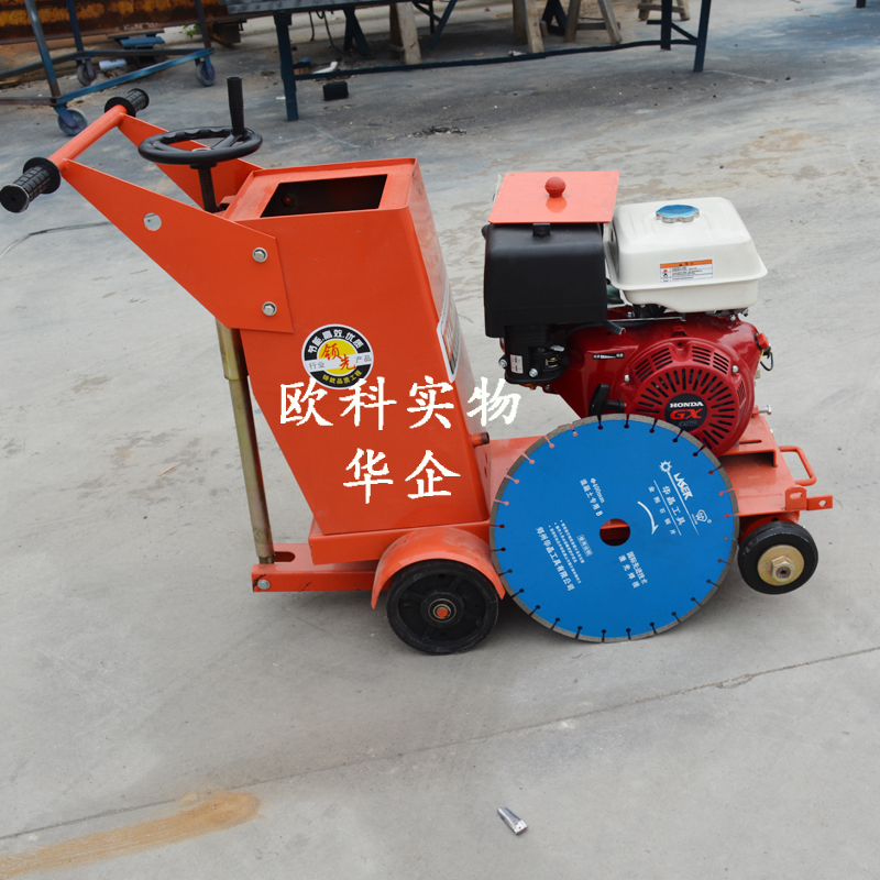 該機型結(jié)構(gòu)簡單、重量輕、切縫平直、工作效率高,使用方便,是上述各行業(yè)進行建筑裝修、路面維護的必備機具。本切割機采用手推行走式切割送進。機頭主軸上安 裝有金剛石鋸片,鋸頭由電動機通過三角皮帶帶動。扶把前安 裝有可調(diào)節(jié)切割深度的手輪,轉(zhuǎn)動手輪使前行走輪升降,從而調(diào)節(jié)鋸片高度。機身上部有盛水水箱,鋸片切割前,應(yīng)擰開水管開關(guān),使管頭向鋸片兩邊噴水以進行冷卻并清除切縫泥垢。