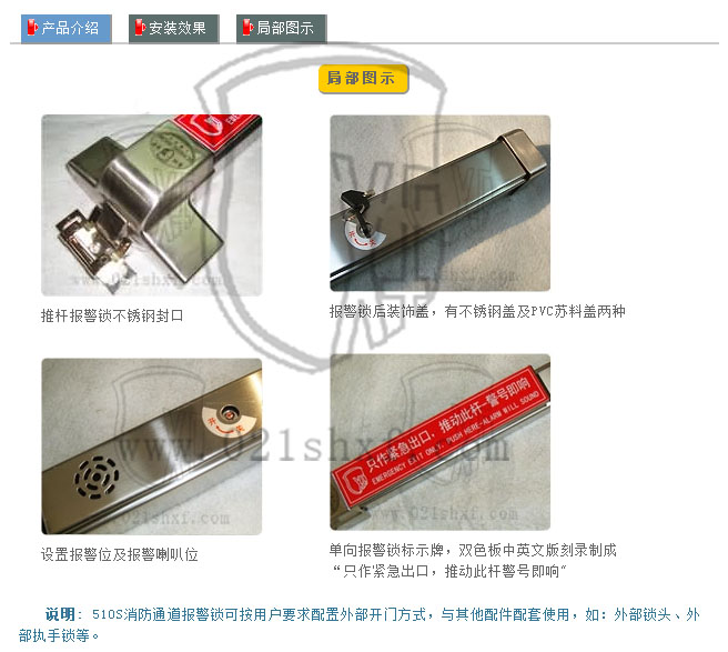 本產(chǎn)品采用不銹鋼材料制造而成,表面拉絲,結(jié)構(gòu)大方簡(jiǎn)樸。使用方便,不易省壞且電池使用周期長(zhǎng)。報(bào)警標(biāo)示以中英文方式顯示(長(zhǎng)度以消防鎖推桿桿長(zhǎng)為準(zhǔn)),紅底白字,采用2.5mm厚的塑料板刻字制成,固定至推桿表面。