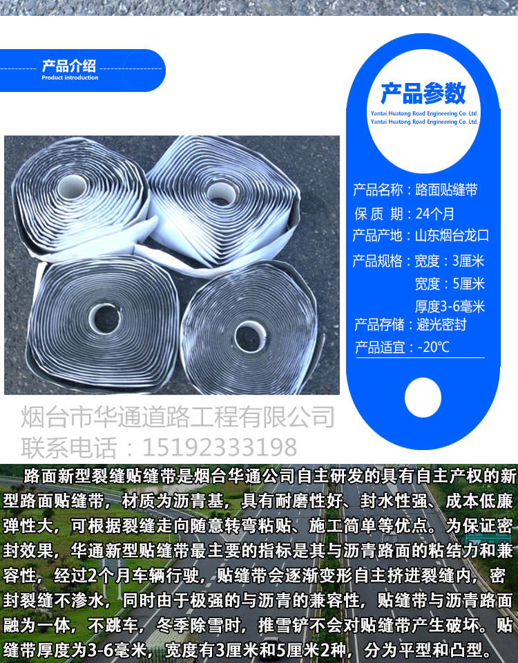 煙臺華通新型貼縫帶超強的粘黏性和低溫的柔軟性等特點受到領導好評。貼縫帶施工不用封閉現場,材質為瀝青基,具有耐磨性好、封水性強、成本低廉、彈性大,可根據裂縫走向隨意轉彎粘貼、施工簡單等優(yōu)點。為保證密封效果,華通新型貼縫帶最主要的指標是其與瀝青路面的粘結力和兼容性,經過2個月車輛行駛,貼縫帶會逐漸變形自主擠進裂縫內,密封裂縫不滲水,同時由于極強的與瀝青的兼容性,貼縫帶與瀝青路面融為一體,不跳車,冬季除雪時,推雪鏟不會對貼縫帶產生破壞。貼縫帶厚度為3-6毫米,寬度有3厘米和5厘米2種,分為平型和凸型2大類,以適應各類寬度和深度裂縫貼縫的需要。