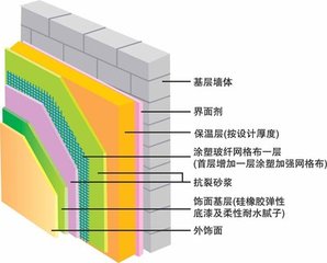 2. 施工要點(diǎn): (1) 新建工程的結(jié)構(gòu)墻體基面必須清理干凈,并檢驗(yàn)墻面平整度和垂直度。用2m靠尺檢查,最大偏差不大于5mm,超差部分應(yīng)剔鑿或用水泥砂漿修補(bǔ)平整。對舊房節(jié)能改造,應(yīng)徹底清理不利于粘貼聚苯 板的原外墻面層,用水泥砂漿修補(bǔ)缺陷,加固找平。 (2) 根據(jù)圖紙要求,在經(jīng)平整處理的外墻面上沿散水標(biāo)高用墨線彈出散水及勒腳水平線;當(dāng)需設(shè)置系統(tǒng)變形縫時(shí),應(yīng)在墻面相應(yīng)位置彈出變形縫及其寬度線,標(biāo)出聚苯 板粘貼位置。 (3) 若首層外保溫墻面粘貼面磚,宜在散水上側(cè)安 裝角鋼托架。 (4) 安 裝聚苯 板: ①、聚苯 板切割:用電熱絲切割器或其他專用工具切割,對角線誤差±2mm,按實(shí)際需要的尺寸加工。尺寸允許偏差為±2mm,大小面垂直。 ②、粘接劑 配制:按配合比用電動(dòng)攪拌器配制粘結(jié)砂漿,一次配制量以45分鐘內(nèi)用完為宜。 ③、變形縫線兩側(cè)的聚苯 板上預(yù)貼250mm寬包底網(wǎng)格布。 ④、在聚苯 板板面四周涂抹一圈粘接劑 ,寬50mm,厚10mm,側(cè)面留30mmx50mm寬排氣口;板心按梅花形布設(shè)粘接點(diǎn),間距150mm-200mm,直徑100mm。粘接砂漿的涂抹面積與聚苯 板面積之比首層不小于40%,其他樓層不小于30%。⑤、抹完粘接劑 后,立即將板立起就位粘貼,粘貼時(shí)應(yīng)輕揉、均勻擠壓,并隨時(shí)用托線板檢查垂直平整。板與板擠緊,碰頭縫處不抹粘接劑 。粘貼聚苯 板應(yīng)做到上下錯(cuò)縫,每貼完一塊板,應(yīng)及時(shí)清除擠出的粘接劑 ,板面不留間隙,如出現(xiàn)間隙,應(yīng)用相應(yīng)寬度的聚苯 板填塞。 ⑥、在外墻轉(zhuǎn)角部位,上下排聚苯 板間的豎向縫應(yīng)為垂直交錯(cuò)連接,保證板材安 裝的垂直度。⑦、聚苯 板接縫不平處應(yīng)用粗砂紙或其他打磨工具磨平,然后再將整個(gè)聚苯 板打磨一遍,粗砂紙應(yīng)襯有平整板材,打磨動(dòng)作宜為輕柔的圓周運(yùn)動(dòng),磨平后應(yīng)用刷子或壓縮空氣將碎屑清理干凈。 ⑧、若設(shè)計(jì)有要求,可在聚苯 板上拉出裝飾縫。