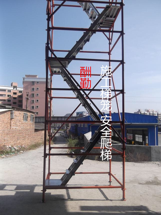 8.為保證施工人員安 全,立桿上每隔495需安 裝橫桿,梯子兩邊均安 放扶手,另外安 全梯的斜桿也要四面安 放,以加強(qiáng)整架的穩(wěn)定性。9.安 全爬梯每隔1.5米安 放一張帶踏步z字形樓梯,每隔4-5米需安 置扣墻件,***大搭設(shè)高度為99米。
