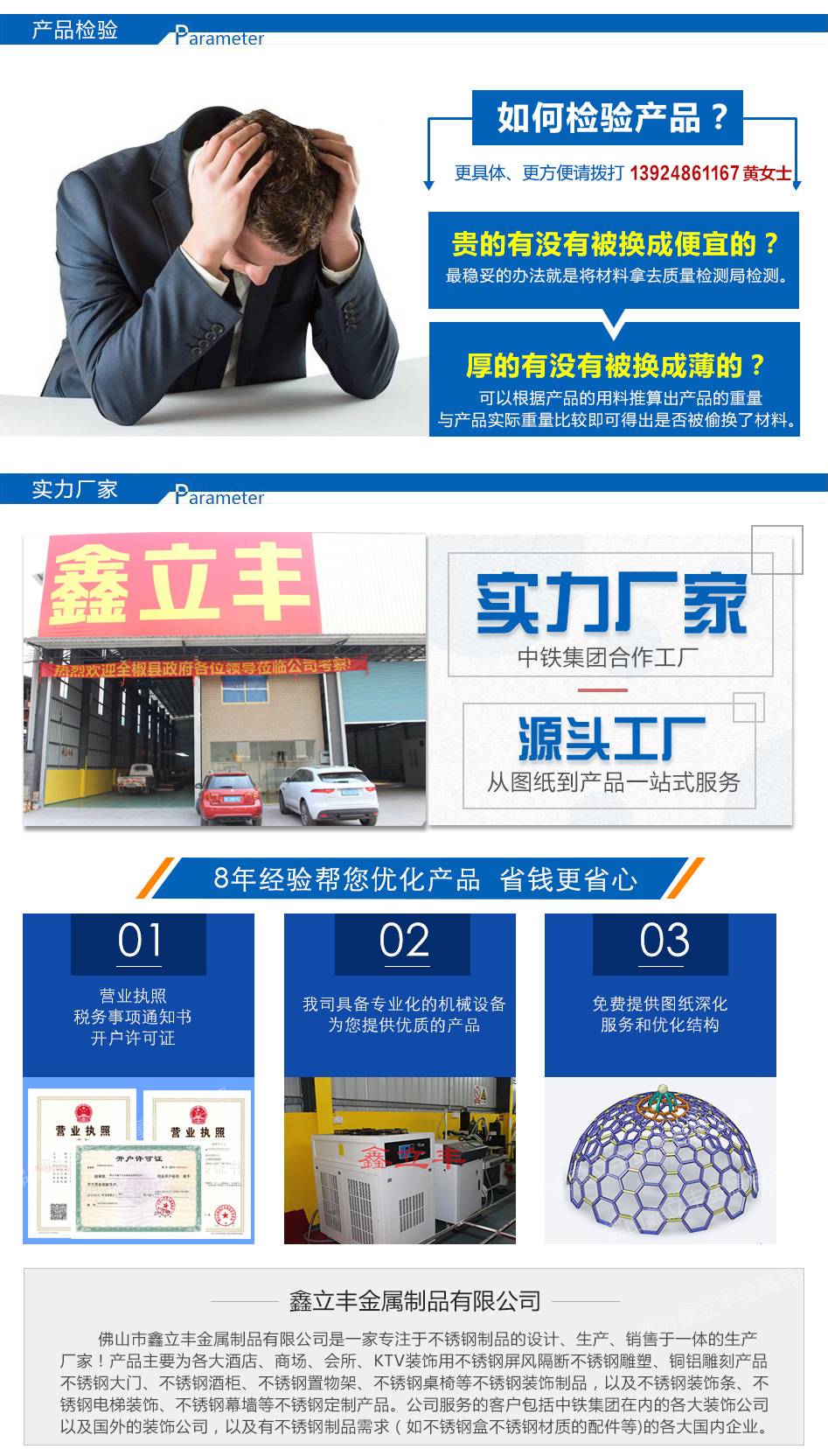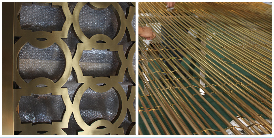 酒店ktv金屬鈦金鏤空不銹鋼屏風(fēng)隔斷、金屬鈦金鏤空不銹鋼屏風(fēng)隔斷制作:主要用不銹鋼原材料進(jìn)行加工和設(shè)計(jì),從而制作而成的屏風(fēng)。不同的屏風(fēng)可采用不同的焊接方法有不同的焊接工藝,分別有線(xiàn)切割焊接、激光焊接、剪壓與焊接、作為一家多年來(lái)從事不銹鋼焊接的工廠,對(duì)焊接產(chǎn)品有著豐富的經(jīng)驗(yàn)。無(wú)論是從外觀裝飾方面考慮,還是從加工難易程度考慮,焊接這一塊,在我廠有著獨(dú)特的優(yōu)勢(shì)。因?yàn)楹附硬粌H僅是焊接,還有著與焊接相關(guān)的一些工藝,從而決定焊接的產(chǎn)品質(zhì)量。它和我們傳統(tǒng)木材屏風(fēng)相比較,酒店ktv金屬鈦金鏤空不銹鋼屏風(fēng)隔斷材料制作的產(chǎn)品表現(xiàn)主要有:工藝精致、光澤度好、結(jié)實(shí)耐用、質(zhì)量穩(wěn)定不易變形、不易風(fēng)蝕腐爛等特點(diǎn)。