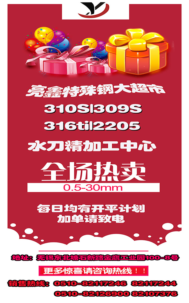 無(wú)錫亮鑫不銹鋼有限公司有大量出售310s、309s、1cr20ni14si2、1cr25ni20si2、316ti、316l、304(l)、317l、347h、321、2205、904l等不銹鋼,規(guī)格齊全,質(zhì)量保證,價(jià)格優(yōu)惠,歡迎新老客戶來(lái)電咨詢洽談。另我公司還可為客戶辦理,開平分條水切割激光切割等離子機(jī)磨砂機(jī)壓花機(jī)拋光磨鏡面等一系列高端加工業(yè)務(wù),真誠(chéng)希望與您的合作!