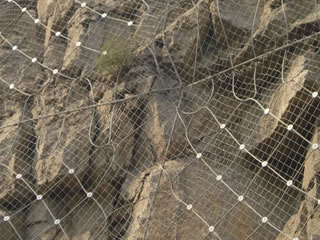 被動防護是由鋼絲繩網(wǎng)、環(huán)形網(wǎng)、(需攔截小塊落石時附加一層鐵絲格柵)、固定系統(tǒng)(錨桿、拉錨繩、基座和支撐繩)減壓環(huán)和鋼柱四個主要部分構(gòu)成。鋼柱和鋼絲繩網(wǎng)連接組合構(gòu)成一個整體,對所防護的區(qū)域形成面防護,從而阻止崩塌巖石土體的下墜,起到邊坡防護作用。