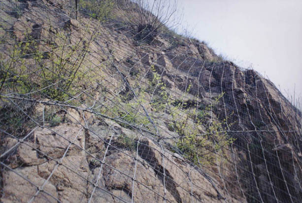 gar2(普通型) 鋼絲繩網(wǎng) 系統(tǒng)鋼絲繩錨桿+支撐繩+縫合繩,孔口凹坑+張拉[或邊沿(上沿)錨固(鋼索錨桿2-4 m 距4.5m)+縱橫向支撐繩(2-∮16)+鋼絲繩網(wǎng)(◇08/300/4*4㎡)+縫合繩(∮8)] 坡面加固,仰制崩塌和風(fēng)化剝落、的發(fā)生,限制局部或少量落石運(yùn)動(dòng)范圍