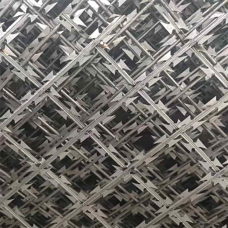 刀片刺繩防護(hù)網(wǎng)是一種新型防護(hù)網(wǎng)。該產(chǎn)品具有嚇阻效果好.美觀.施工便利.經(jīng)濟(jì)實(shí)用等優(yōu)異特點(diǎn)。刀片刺繩防護(hù)網(wǎng)主要用于園林公寓.機(jī)關(guān)單位.監(jiān)獄.哨所.邊防等的圈禁防護(hù)。刀片刺繩防護(hù)網(wǎng)由銳利尖角鍍鋅鋼板或不銹鋼薄板做刀片,高張力鋼絲做芯線組合而成的阻絕器材。由于刀片刺繩防護(hù)網(wǎng)造形獨(dú)特不易觸摸,因而能達(dá)到極好的防護(hù)隔離效果。直線形刀片刺網(wǎng)由刀片型直線刺網(wǎng)交叉焊接成型,可用于防盜窗、高速護(hù)欄、隔離柵。施工迅速、效果顯著。刀片刺繩防護(hù)網(wǎng),有多種架設(shè)方式可供選擇,施工迅速,既省經(jīng)費(fèi),又可達(dá)到嚇阻的效果。