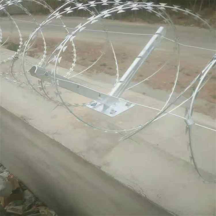 圍墻用刺絲滾籠由帶底盤的v型架和普通刺繩結(jié)合熱鍍刺絲滾籠連接而成,安 裝方法簡易快捷,成本低,防護效果好,刺絲滾籠材質(zhì)有熱鍍和不銹鋼兩種,具體采購方法根據(jù)單位采購方案進行,不銹鋼刺絲滾籠和熱鍍的根本區(qū)別就是,熱鍍的隨著年限的增加會失去之前的顏色,慢慢腐蝕生銹,而不銹鋼的會終生不生銹,只不過是價格稍微小貴了一點,客戶量力選擇