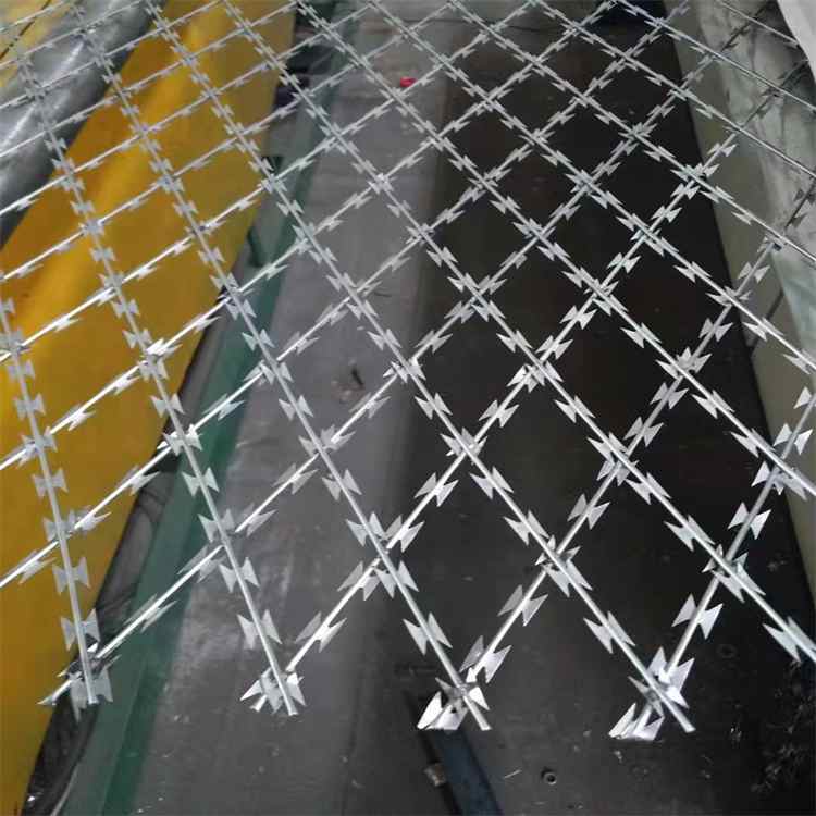 刀片刺繩也稱為刀片刺絲、刀片刺網(wǎng),是一種新型護欄網(wǎng)產(chǎn)品。它具有嚇阻效果好、美觀、施工便利,經(jīng)濟實用等優(yōu)異特點。主要用于園林公寓,機關(guān)單位,監(jiān)獄,哨所,邊防等的圈禁防護。刀片刺網(wǎng)由熱鍍鋅鋼板或不銹鋼薄板沖壓出尖銳的刀片狀,高張力鍍鋅鋼絲或者不銹鋼絲做芯線組合而成的阻絕器材。由于刺網(wǎng)造形獨特不易觸摸,因而能達到極好的防護隔離效果。產(chǎn)品的主要材質(zhì)有鍍鋅板和不銹鋼板。