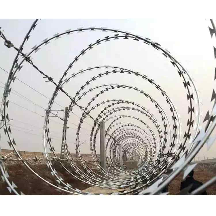 鐵路刺絲滾籠新建鐵路時速200公里以上,采用2.2米高度鋼筋混凝土防護柵欄+0.5米刺絲滾籠,設計時速200公里以下鐵路,一般地段采用1。8米高度鋼筋混凝土防護柵欄+0.5米刺絲滾籠,刺絲滾籠采用刀片刺繩繞圈后相鄰兩圈每隔120°用鐵絲連接卡固定,張開后形成蛇腹網(wǎng)狀,閉合后刀片刺繩圈徑為50cm,張開后每交叉圈安 裝間距20cm,直徑不小于45cm,刺絲滾籠下緣距離鋼筋混凝土防護柵欄上緣的垂直距離為0.05米。