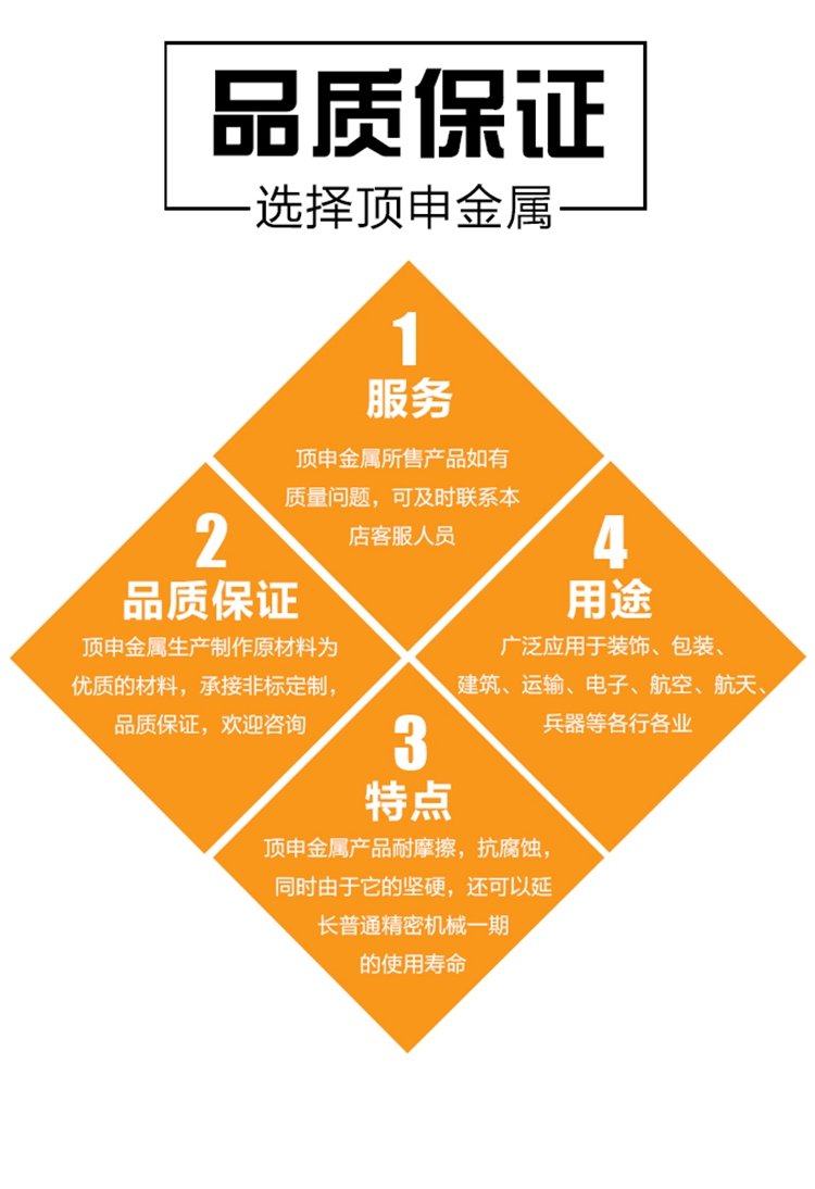 6、服務(wù):充分理解客戶的需求,有效衡量原材料的利用,最大化的縮短供貨_交期_和提高供貨_質(zhì)量,為客戶提供完善的從原材料選擇,切割、探傷、加工、貼膜、包裝、運(yùn)輸?shù)囊粩堊咏鉀Q方案。