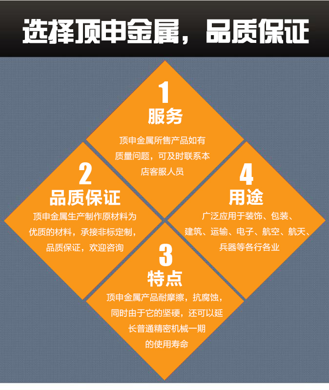 6、服務(wù):充分理解客戶的需求,有效衡量原材料的利用,最大化的縮短供貨_交期_和提高供貨_質(zhì)量,為客戶提供完善的從原材料選擇,切割、探傷、加工、貼膜、包裝、運(yùn)輸?shù)囊粩堊咏鉀Q方案。
