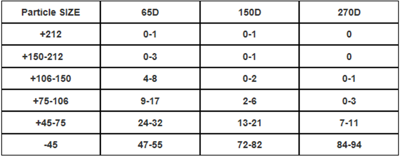 2.粒度:65d、150d、270d、70目 100目、200目、325目等等