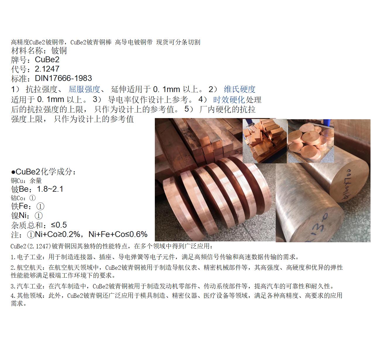 汽車領(lǐng)域:Materion Performance Alloys的Alloy 174帶材(C17460)是一種銑削硬化銅鈹帶材合金,設(shè)計用于汽車、電器和數(shù)據(jù)通信/電信市場。在汽車的電氣系統(tǒng)、發(fā)動機(jī)部件以及其他需要高強(qiáng)度和高導(dǎo)電性的部位都可能會使用到C17460 - 390 - HT鈹銅帶,例如汽車發(fā)動機(jī)中的一些傳感器部件,需要在高溫、振動和復(fù)雜的化學(xué)環(huán)境下準(zhǔn)確工作,該鈹銅帶的綜合性能能夠滿足這些要求 |