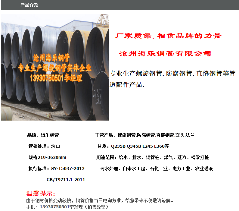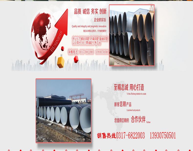 公司主要生產(chǎn)ф219-3600mm壁厚6mm-40mm的雙面埋弧焊螺旋管,填補(bǔ)了我國大口徑厚壁螺旋管,厚壁螺旋管及大 口徑螺旋管的空缺。公司擁有6條大型鋼管生產(chǎn)線,年產(chǎn)螺旋鋼管30萬噸,材質(zhì)有q235b、q345b(16錳)、20#、l245、 l290,我們率先通過了iso9001-2000國際體系認(rèn)證_,并一次性獲得國家質(zhì)檢檢疫總局頒發(fā)的特種設(shè)備制造許可證_。先 進(jìn)的生產(chǎn)設(shè)備,完備的檢測(cè)手段,高素 質(zhì)的管理和技術(shù)人才, 目前我公司產(chǎn)品已覆蓋全國,產(chǎn)品質(zhì)量和優(yōu)質(zhì)的服務(wù) 得到了顧客認(rèn)可。公司在管理、生產(chǎn)、檢測(cè)、銷售服務(wù)過程中,靠科學(xué)管理,提高了質(zhì)量, 靠質(zhì)量增強(qiáng)了信譽(yù),靠 信譽(yù)贏得了顧客,靠顧客發(fā)展了企業(yè)。