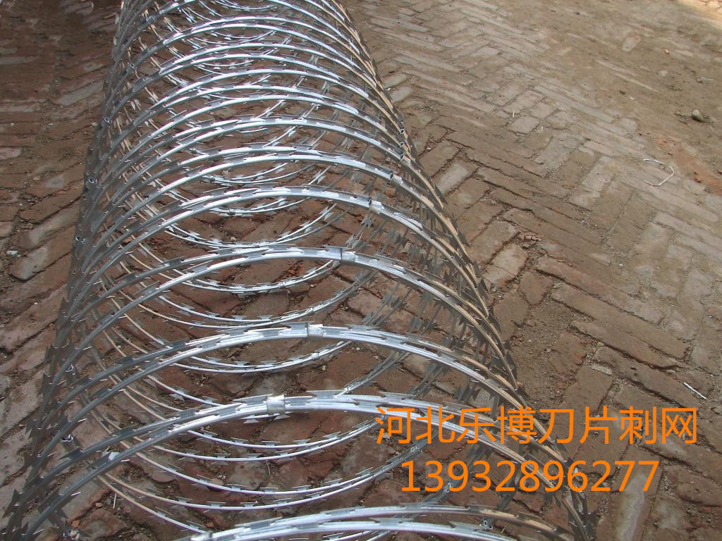 刀片刺絲又名刮刀型刺絲,是一種近年發(fā)展起來(lái)的防護(hù)、隔離能力較強(qiáng)的新型防護(hù)網(wǎng)產(chǎn)品。它采用鋼板沖壓成型包附于鋼絲(筋絲)之上,由銳利尖角鍍鋅鋼板或不銹鋼薄板做刀片,高張力鋼絲做芯線組合而成的。鋒利的刀型刺由雙線扣裝后成蛇腹?fàn)?既美觀又讓人不寒而粟。起到了很好的阻嚇作用。該產(chǎn)品具有美觀、防阻效果好、施工便利等優(yōu)點(diǎn)。世界各國(guó)已將刀片刺網(wǎng)廣泛用于軍事重地、監(jiān)獄、政府機(jī)關(guān)、銀行,以及生活小區(qū)圍墻、私人住宅、別墅的圍墻、門窗、高速公路、鐵路護(hù)欄以及邊境線等用來(lái)防護(hù)保安 。