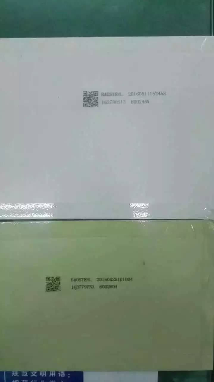 3.產(chǎn)品本身。上海寶鋼彩鋼板為立式精包裝、卷心朝上。黃石寶鋼彩鋼板為臥式精包裝。正常情況下正品寶鋼彩鋼板背面都是有電子噴碼的,有標注牌號如tdc51d+z或者az,爐號,顏色代號,如海藍(404)以及生產(chǎn)日期_等,這些信息都可以與鋼卷外標簽 以及質(zhì)保書上的內(nèi)容對上。另從2016年5月份后寶鋼彩涂卷開始全線生產(chǎn)使用二維碼噴碼防偽標志,且每隔3-5米就有二維碼噴碼,用戶可用微信掃一掃來掃描鋼卷背面的二維碼,掃描結果會顯示該卷是何年何月何日 幾時幾分生產(chǎn)的,該噴碼被掃描過幾次,在哪些地域被掃描等詳細信息,寶鋼實行這一最新二維碼噴碼防偽操作真乃是廣大寶鋼彩鋼卷用戶的一大福音,從而進一步使用戶能夠購買到真正的上海寶鋼總部的彩鋼卷。上海川黎金屬(如遇噴碼機壞了,會采用人工噴碼,在卷的卷頭和卷尾。當然這不是鑒別寶鋼彩鋼板正品與否的唯一標準);