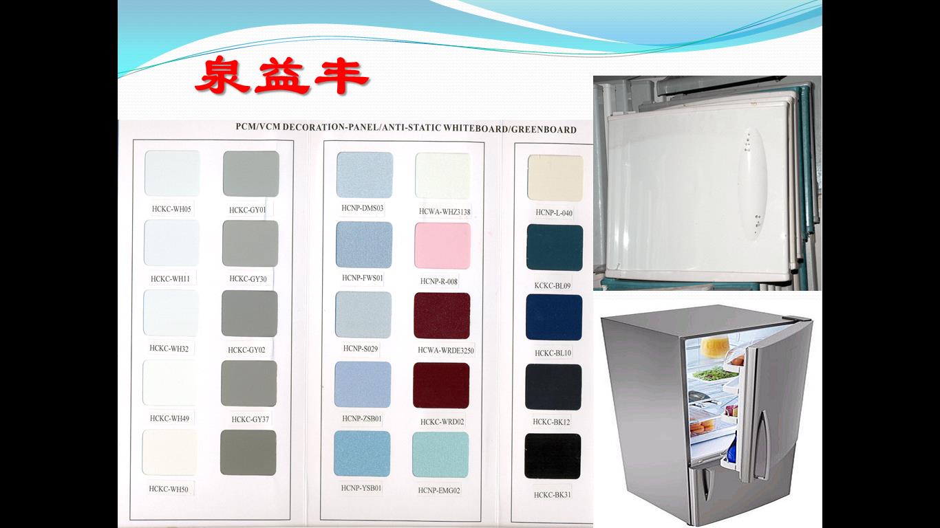 pcm為彩色預涂板材,表面為家電環(huán)保油漆,價格相對于vcm較為便宜,一般應用于冰 箱側板,此種板材不適用于高檔冰 箱的面板,由于板材的想對平整度較vcm差和顏色效果單一,因此主要是側板的使用。
