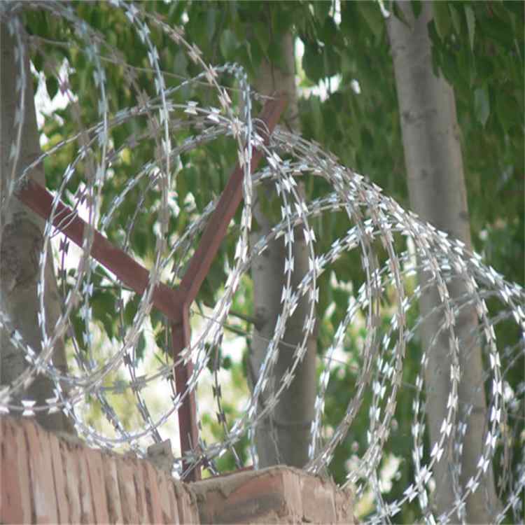 刀片刺繩又名刮刀型刺絲,是一種發(fā)展起來的防護(hù)、隔離能力較強(qiáng)的新型防護(hù)網(wǎng)產(chǎn)品。 鋒利的刀型刺由雙線扣裝后成蛇腹?fàn)?既美觀又讓人不寒而栗。起到了很好 的阻嚇作用。同時該產(chǎn)品具有美觀、防阻效果好 、施工便利等優(yōu)點。