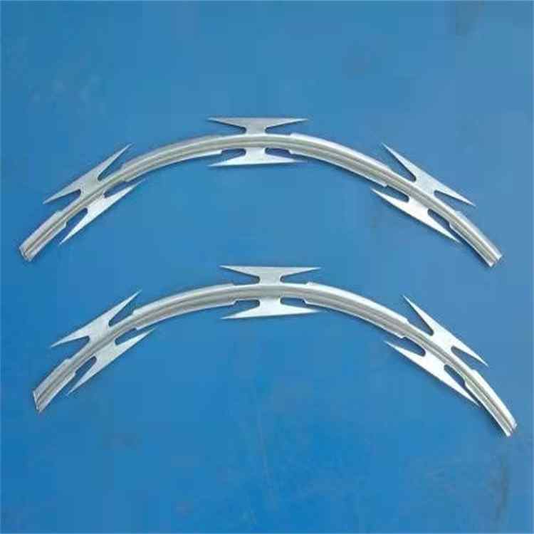 平板式刀片刺繩是刀片刺網(wǎng)的一種新的應(yīng)用方式,它是將單圈式刀片刺網(wǎng)平壓成板狀,或?qū)杉䥺稳Υ叹W(wǎng)壓平后交叉相錯(cuò)使用,外表美觀而且實(shí)用,可與直線式刀片刺網(wǎng)搭配使用,構(gòu)成下直線上平板的防護(hù)墻,或僅用平板式刺網(wǎng)構(gòu)成防護(hù)墻。主要適用于小區(qū)、倉庫、畜牧廠、農(nóng)場、礦山、監(jiān)獄、國防重地等。