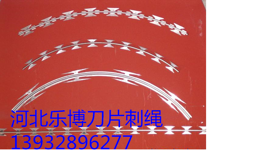 工藝:采用鋼板(刀板)沖壓成型包附于熱鍍鋅鋼絲(芯線)之上,由銳利尖角鍍鋅鋼板或 不銹鋼薄板做刀片,高張力鋼絲做芯線組合而成的。
