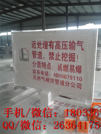 復合材料標志樁,警示牌,標志磚。電力玻璃鋼標志牌 油氣管道標志牌 玻璃鋼電纜標志牌廣泛應(yīng)用于電力、天然氣、供水、通信、污水、石油、石化、礦山等管線地埋隱蔽工程。1、材料:高強度玻璃纖維復合材料模壓制作(回收無用)。2、復合材料標志樁產(chǎn)品表面文字用特種絲印及凹型處理,一次著色固化成型。3、復合材料標志樁顏色艷麗、抗老化、強度好,使用壽命可達35年以上。4、電力玻璃鋼標志牌 油氣管道標志牌 玻璃鋼電纜標志牌真正免維護,不同于水泥、石頭等材料需要定時每年去上油漆、噴字,省卻維護工時費用,產(chǎn)品表面文字基礎(chǔ)堅硬,耐磨持久。也可按用戶單位提供的樁號,里程數(shù),路徑方向指示箭頭,維護電話等信息資料逐個定做。5、電力玻璃鋼標志牌 油氣管道標志牌 玻璃鋼電纜標志牌安 裝方法:挖掘所埋深度坑,前后左右十字交叉穿入兩根25 cm鋼筋,水泥石子固定即可。圓形路面磚采用圓形開孔器按所需大小管道穿越路面打孔,下部用水泥濃漿固定,上口與路面齊平即可。6、復合材料標志樁全方位工程給甲 方單位提升企業(yè)標準化管理新形象,具體尺寸可按要求定制。7、復合材料標志樁相關(guān)技術(shù)數(shù)據(jù): 1、拉伸強度160mpa