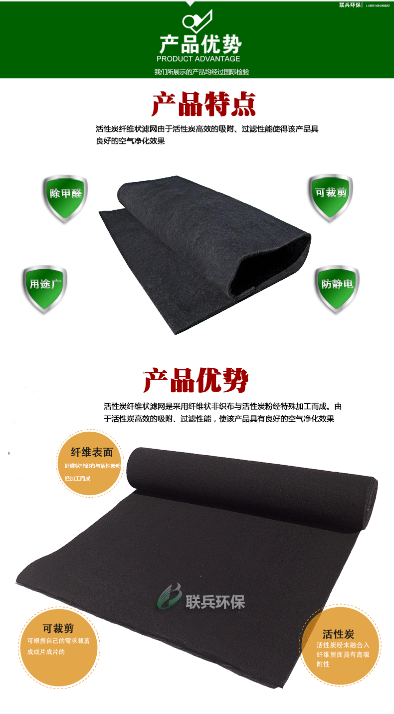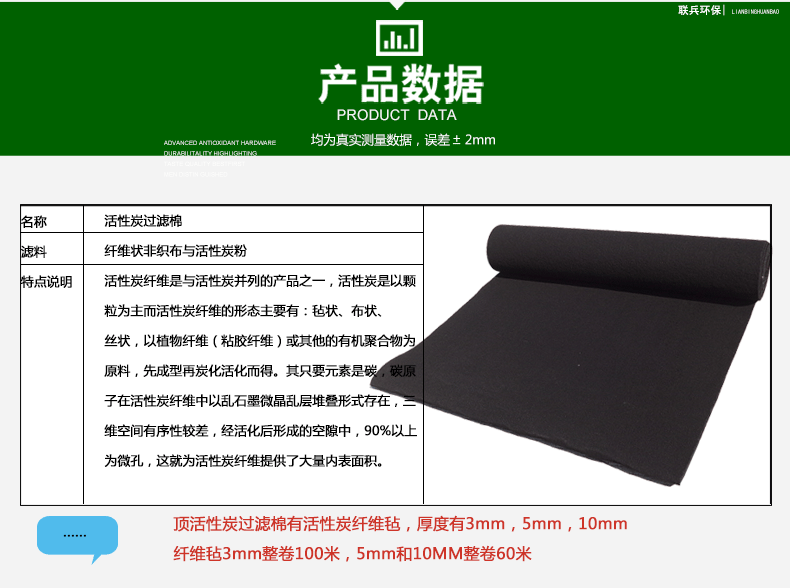 瀏覽:138次[供應(yīng)]聯(lián)兵環(huán)保空氣和水處理除異味3mm厚活性炭纖維氈布活性炭過濾棉