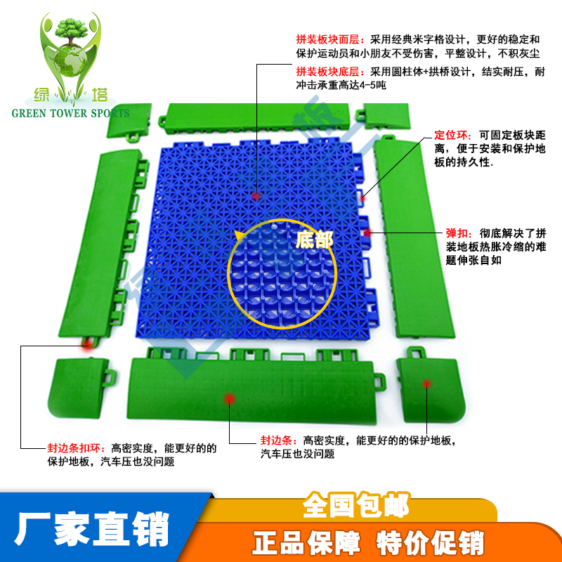 ⑥綠塔拼裝地板十余種顏色顏色多樣可以自由搭配,新穎、美觀。球場檔次高。