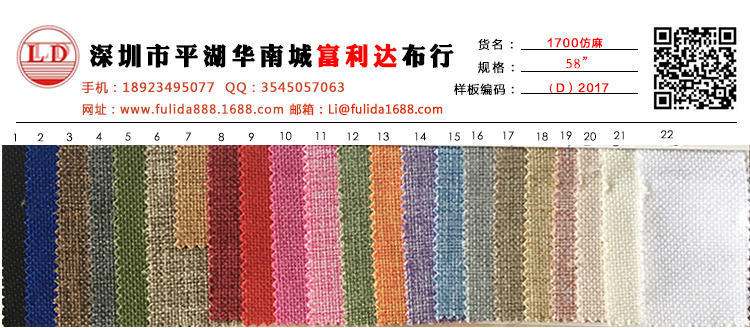 富利達(dá)布行簡(jiǎn)介:我司專門(mén)致力于牛津布、箱包布、特殊面料以及尼龍系列的生產(chǎn)和開(kāi)發(fā),經(jīng)過(guò)20年的努力,輻射珠江三角洲,在深圳華南國(guó)際工業(yè)原料城、廣州市花都獅嶺皮革城、東莞茶山國(guó)際布料交易市場(chǎng)以及深圳光明新區(qū)都設(shè)有門(mén)市部及辦公室,公司銷售人員達(dá)到50人,目前還在逐步增長(zhǎng)中,經(jīng)營(yíng)面積也達(dá)到1000平方米,同時(shí)我司也在國(guó)內(nèi)外各大交易平臺(tái)上的廣告 投入也至少達(dá)到10萬(wàn)元以上。在華南城2002年開(kāi)業(yè)之初,我司就就看中華南城這個(gè)商業(yè)地段,將所有的布料廠家都集中到一起,所謂有戰(zhàn)爭(zhēng)才有市場(chǎng),我司也看好華南城的投資理念,當(dāng)時(shí)我司總經(jīng)理李炳法就當(dāng)即決定進(jìn)駐華南城,到目前為止已達(dá)10年之久。在華南城就設(shè)有兩個(gè)門(mén)市部,門(mén)市營(yíng)業(yè)面積也達(dá)到500平方米。