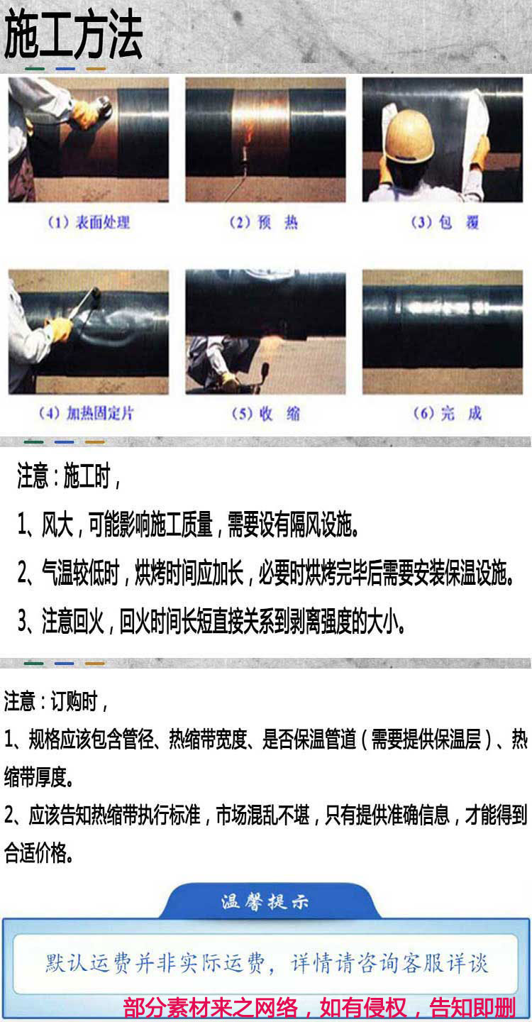 1、具有熱縮性能,可以使用明火加溫,是的熱縮帶更加緊密粘合防腐部位。