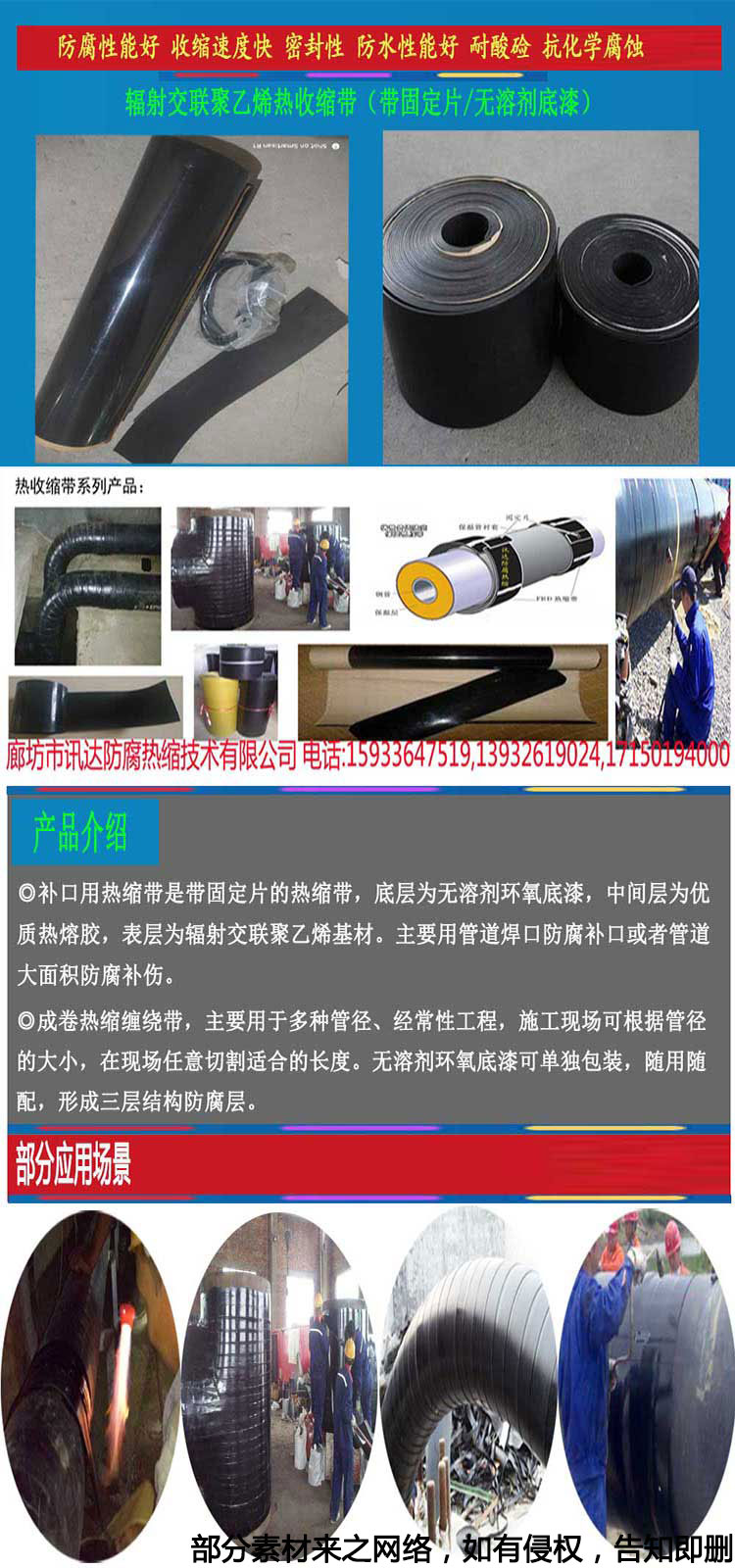 熱縮纏繞帶,主要用于鋼管彎曲部位纏繞熱縮包覆防腐和管道層破損修復(fù),也可用于整管的纏繞防腐處理?扇我獠眉,方便施工。