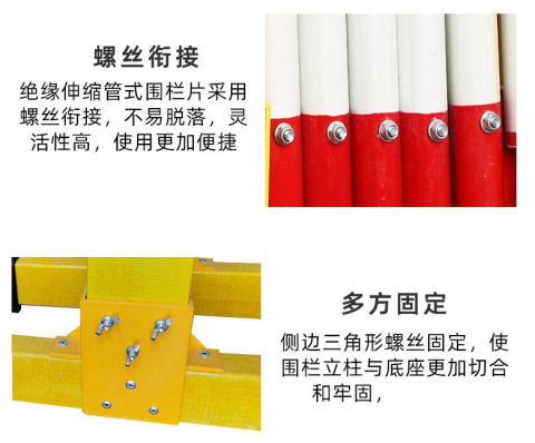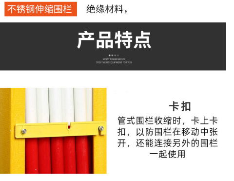 玻璃鋼伸縮圍欄特點(diǎn):由玻璃鋼管(片)組合而成,可伸縮。圍欄用絕緣材料做成,這種遮欄可以與帶電設(shè)備的導(dǎo)電部分接觸,如將導(dǎo)電部分罩住等,這就要求遮欄有良好的絕緣體性能.