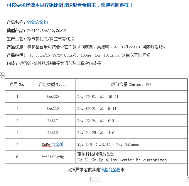 產(chǎn)品優(yōu)點:鋅和鋁含量可按要求在任意區(qū)間定做,常規(guī)粉 znA110和2nA130可隨時產(chǎn)品粒徑:15-50um/15-46/20-68um/45-106um; 1um-150um 或 40目以下區(qū)間粉包裝:相箔袋/塑料瓶/鐵桶等普通包裝或真室包裝等