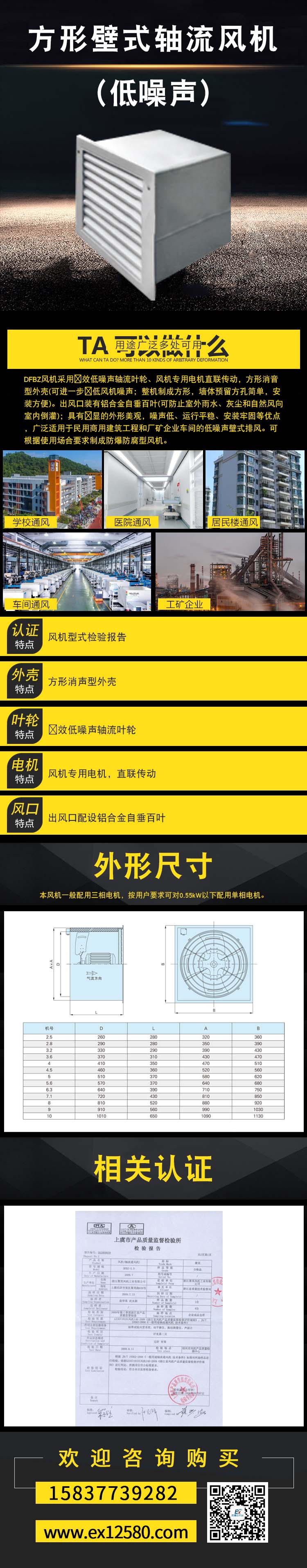 dfbz風機采用☒效低噪聲軸流葉輪、風機專用電機直聯傳動,方形消音型外殼(可進一步☒低風機噪聲;整機制成方形,墻體預留方孔簡單,安 裝方便)。出風口裝有鋁合金自垂百葉(可防止室外雨水、灰塵和自然風向室內倒灌);具有☒顯的外形美觀,噪聲低、運行平穩(wěn)、安 裝牢固等優(yōu)點,廣泛適用于民用商用建筑工程和廠礦企業(yè)車間的低噪聲壁式排風?筛鶕褂脠龊弦笾瞥煞辣栏惋L機。 本風機一般配用三相電機,按用戶要求可對0.55kw以下配用單相電機。