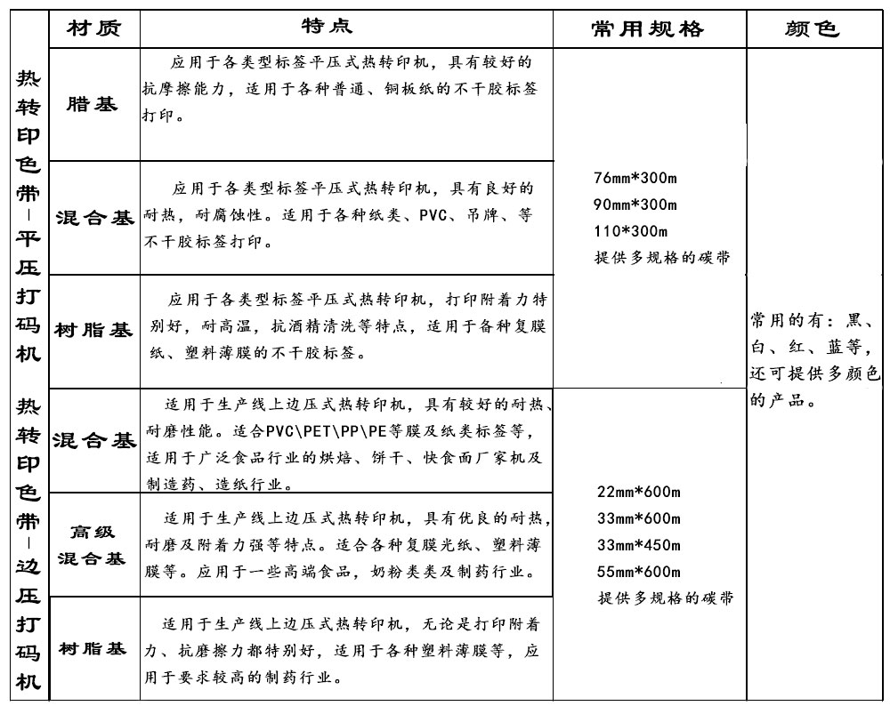 1. 混合基 適用于生產(chǎn)線上邊壓式熱轉(zhuǎn)印機(jī),具有較好的耐熱、耐磨性能。適合pvc\pet\pp\pe等膜及紙類(lèi)標(biāo)簽 。廣泛適用于食品行業(yè)的烘焙、餅干、快食面廠家及制藥、造紙行業(yè)。