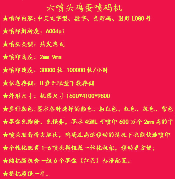 這是一款為蛋殼上噴碼的高清晰度,高速度,多功能,免維護(hù)的一款六噴頭蛋品噴碼機(jī),可以直接放蛋托上同時(shí)打印。