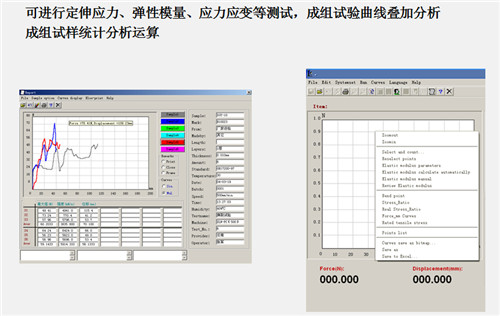 可進(jìn)行定伸應(yīng)力、彈性模量、應(yīng)力應(yīng)變等測(cè)試、成組實(shí)驗(yàn)曲線折疊加分析