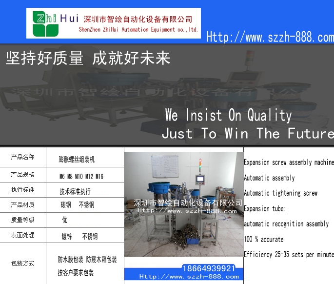 了解不銹鋼膨脹螺絲組裝機(jī)最想知道的就是本款機(jī)器效率、穩(wěn)定性、價(jià)格、售后保障。深圳智繪于2008年開始研發(fā)、生產(chǎn)膨脹螺絲組裝機(jī),到現(xiàn)在2019年;在緊固件自動(dòng)化設(shè)備行業(yè)建立了良好的口碑效果。很多新客戶都是由老客戶介紹過來訂購的。