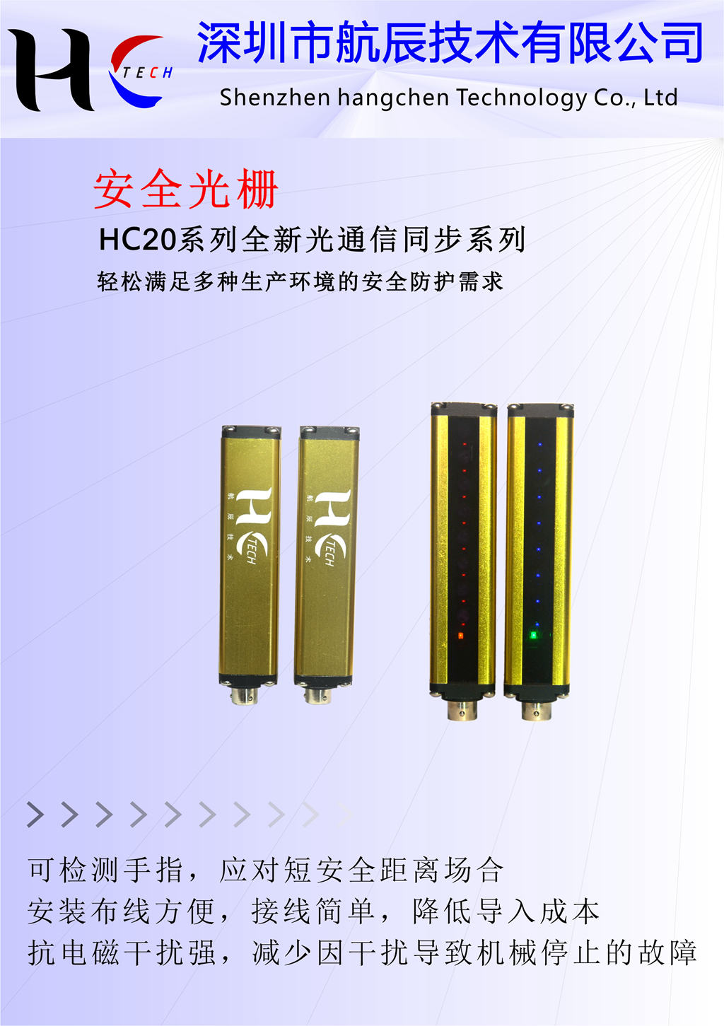 安 全光柵哪里價格好,選航辰光同步安 全光柵。hc40系列長距離保護(hù)安 全光柵是深圳市航辰技術(shù)有限公司研發(fā)生產(chǎn)的一款光通信同步技術(shù)的區(qū)域型紅外線傳感器,采用光同步技術(shù)安 裝布線更簡易,免去傳感線同步安 全光柵要布幾十米同步信號線的煩惱。可視化設(shè)計,每一路受光、發(fā)光通道都有相應(yīng)單獨的狀態(tài)指示功能,再遠(yuǎn)的安 裝距離也輕松調(diào)試,通光與否一目了然。npn/pnp雙端口輸出模式,供客戶自由選擇。