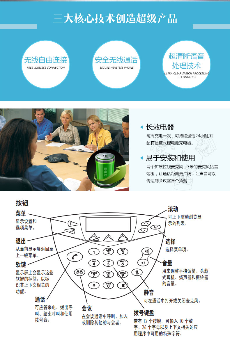寶利通soundstation 2w標(biāo)準(zhǔn)型無限自由——在離基座遠(yuǎn)至45米之內(nèi)都可以擺脫線纜束縛,召開會(huì)議,適用于60平米以內(nèi)會(huì)議室,大約25人左右會(huì)議,無線會(huì)議系統(tǒng),超清晰的語音處理技術(shù),長(zhǎng)時(shí)間的待機(jī)時(shí)長(zhǎng),遠(yuǎn)距離的信號(hào)識(shí)別,會(huì)議開得更隨意、輕松、無所顧慮。