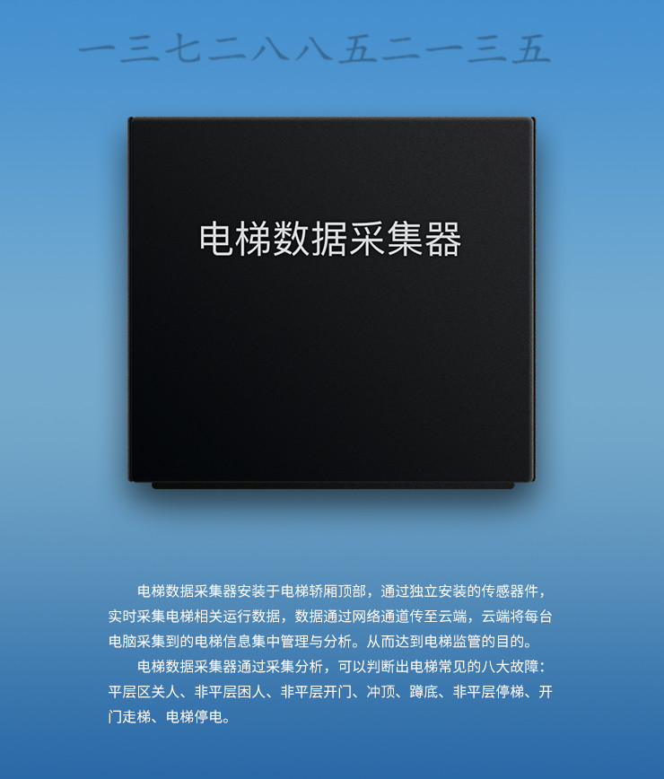 電梯數(shù)據(jù)采集器通過采集分析,可以判斷出電梯常見的八大故障:平層區(qū)關(guān)人、非平層困人、非平層開門、沖頂、蹲底、非平層停梯、開門走梯、電梯停電。