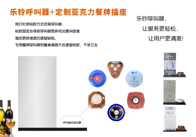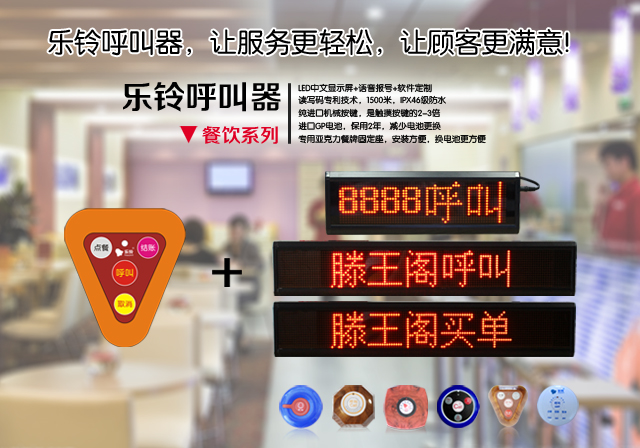 樂鈴呼叫器,讓服務(wù)更輕松,讓用戶更滿意,可自定義中文房號,包房名稱,呼叫內(nèi)容,可播報(bào)中文語音房號,樂鈴無線呼叫器-hb100呼叫器,推薦使用:酒店,餐廳、茶樓、咖 啡 廳等,呼叫器+亞克力餐牌插座,支持方案定制。