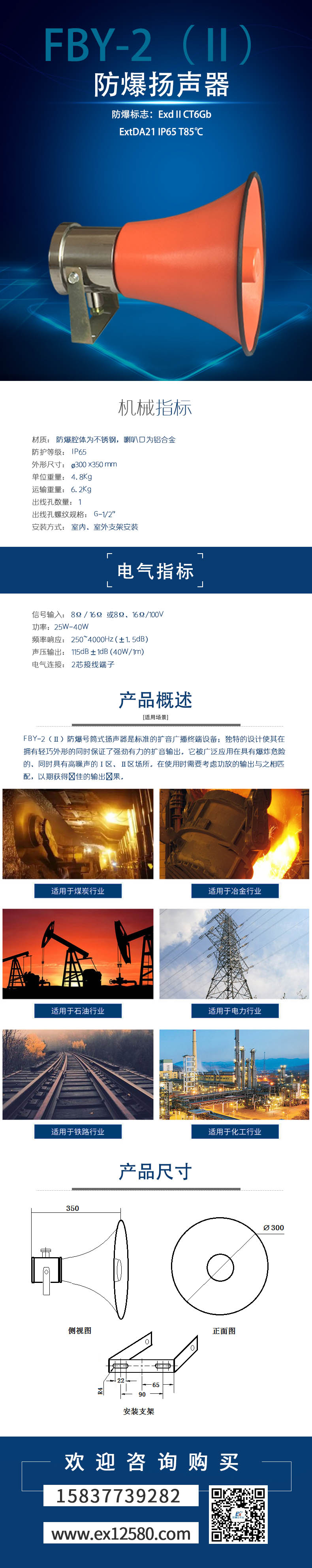 fby-2(ⅱ)防爆號筒式揚(yáng)聲器是標(biāo)準(zhǔn)的擴(kuò)音廣播終端設(shè)備;獨特的設(shè)計使其在擁有輕巧外形的同時保證了強(qiáng)勁有力的擴(kuò)音輸出。它被廣泛應(yīng)用在具有爆炸危險的、同時具有高噪聲的ⅰ區(qū)、ⅱ區(qū)場所。在使用時需要考慮功放的輸出與之相匹配,以期獲得☒佳的輸出☒果。